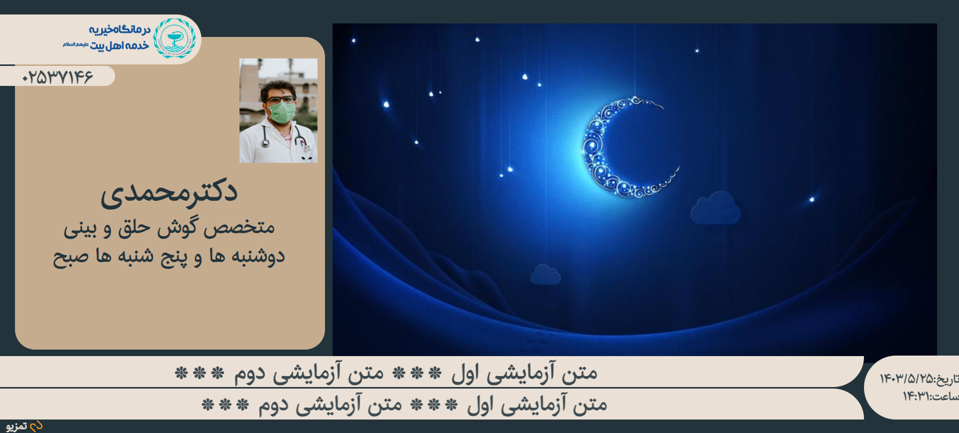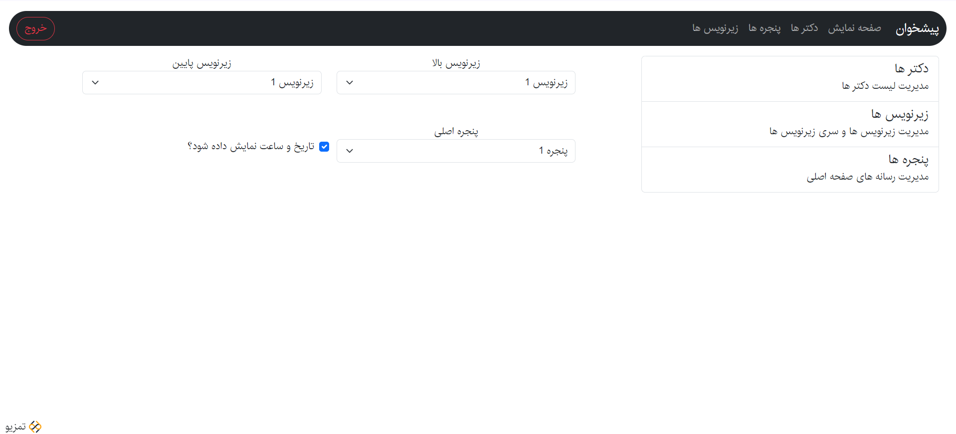 این پروژه که در سال 1402 توسعه داده شد و وارد فاز عملی شد؛ با هدف نمایش اطلاعات و مشخصات مدنظر درمانگاه خیریه اهل البیت بر روی صفحات نمایش موجود در درمانگاه مورد استفاده قرار گرفته است. توسعه بک اند این پروژه با فریمورک دات نت و فرانت اند با کتابخانه ویو جی اس انجام گشته است.